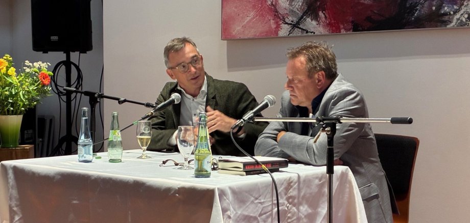 Zwischen den beiden spannte sich im Verlaufe des Abends ein unterhaltsames Zwiegespräch auf, dem Rödders 2024 erschienenes Buch „Der verlorene Frieden. Vom Fall der Mauer zum neuen Ost-West-Konflikt“ zu Grunde lag, zu dessen Thesen und Einordnungen Michael Au zugespitzte und teils provokante Fragen an den Autoren stellte.