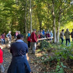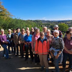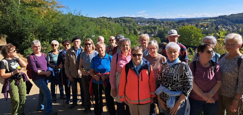 Bei schönem Wanderwetter trafen sich am Mittwoch, den 1.Oktober 2025 21 vergnügte Wanderinnen- und Wanderer am Bahnhof Schladern zu einer Tour mit tollen Aussichten und vielen Windecker Schönheiten am Wegesrand. Los gings um 14.00 Uhr vom Bahnhof über die L333 „An der Teichhardt“ herauf, vorbei an Wohnhäusern zu einem beginnenden Laubwald.