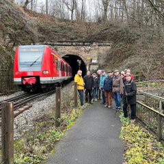 Die Gruppe wanderte von der Raiffeisenstraße in Rosbach immer an der Sieg entlang nach Schladern. Vorbei am Bahnhof, der Unterführung, Kulturzentrum Kabelmetall und Ersteigung des Aussichtspunktes mit Blick auf die Siegfälle. Die Wanderung führt weiter zwischen Schladern und Sieg entlang, bis zu einer Steigung. Oben angekommen überquert die Wandergruppe auf einer Fußgängerbrücke die Sieg.